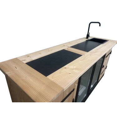 Kies onderstaand je formaat, het formaat wat wordt weergegeven is de maat van het gehele blad. Het blad heeft altijd aan de linker- en rechterzijde een overstek van +/- 5 cm, aan de voorzijde is is +/- 6 cm. Wil je toch een ander formaat buitenkeuken? We kunnen voor iedere formaat een offerte maken!